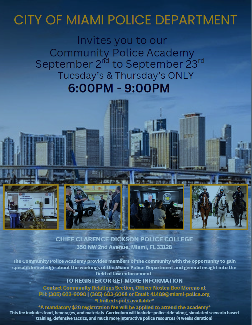 The City Of Miami Police Department invites you to the Community Police Academy from September 2nd to September 23rd Tuesday's and Thursday's Only 6:00PM - 9:00PM. Click on the flyer for more info.