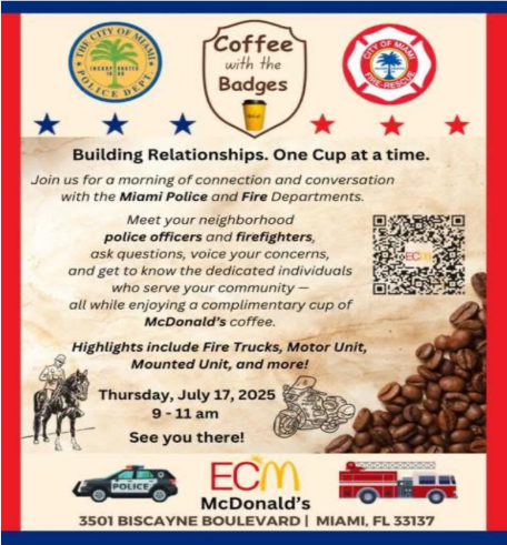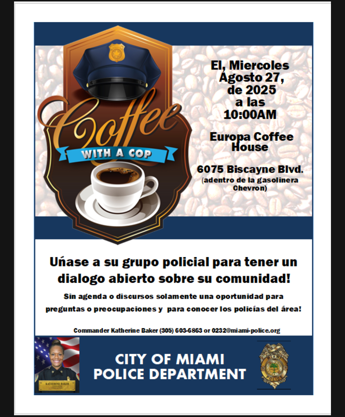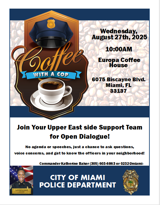 Meet Commander Freddie Cruz at the Coffee with a COP on Tuesday, August 5, 2025 at 8:30 a.m. See flyer for more details
